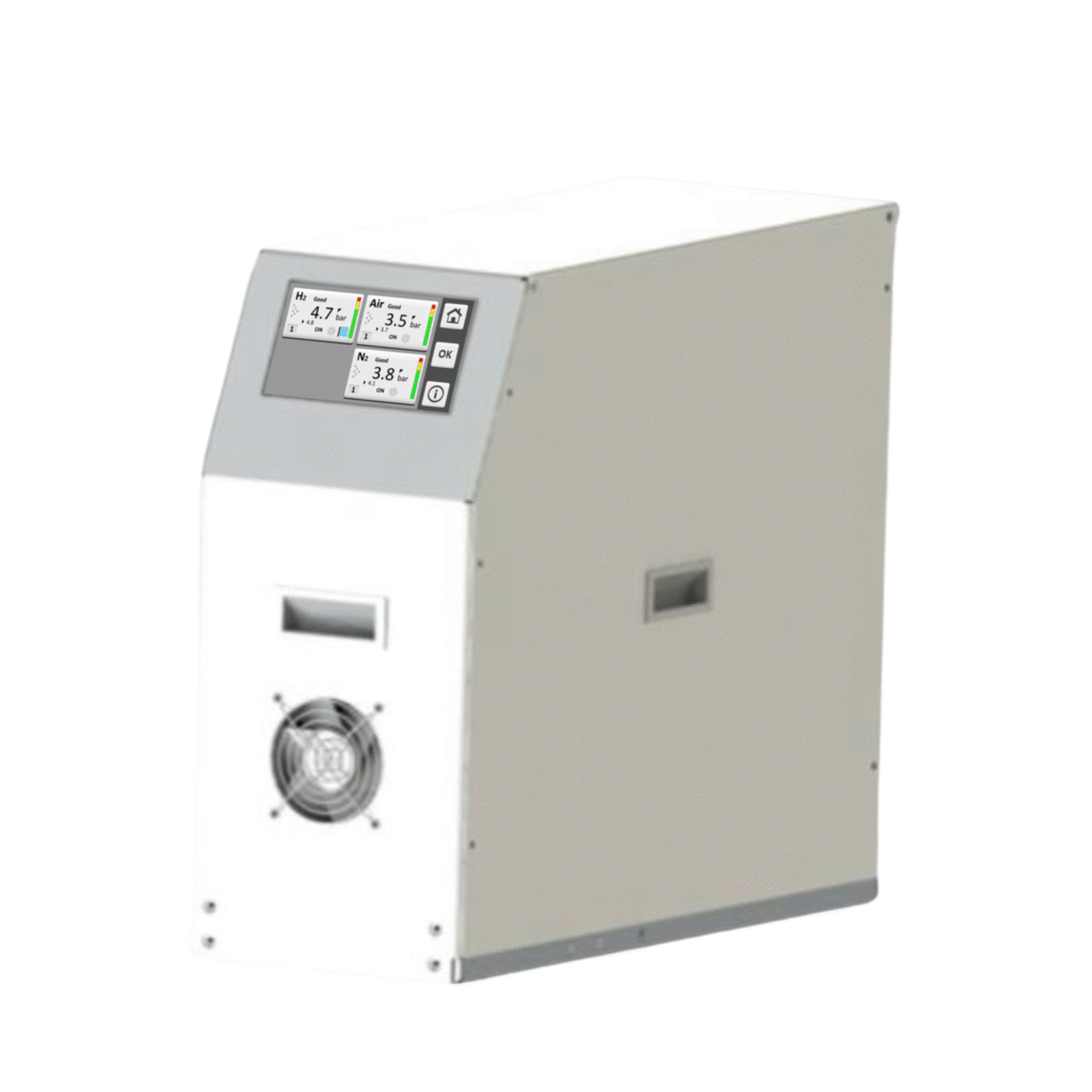 The GCSTATION NEO comprises a high-purity Hydrogen generator, zero-air and Nitrogen generators, and an air compressor system.